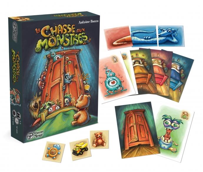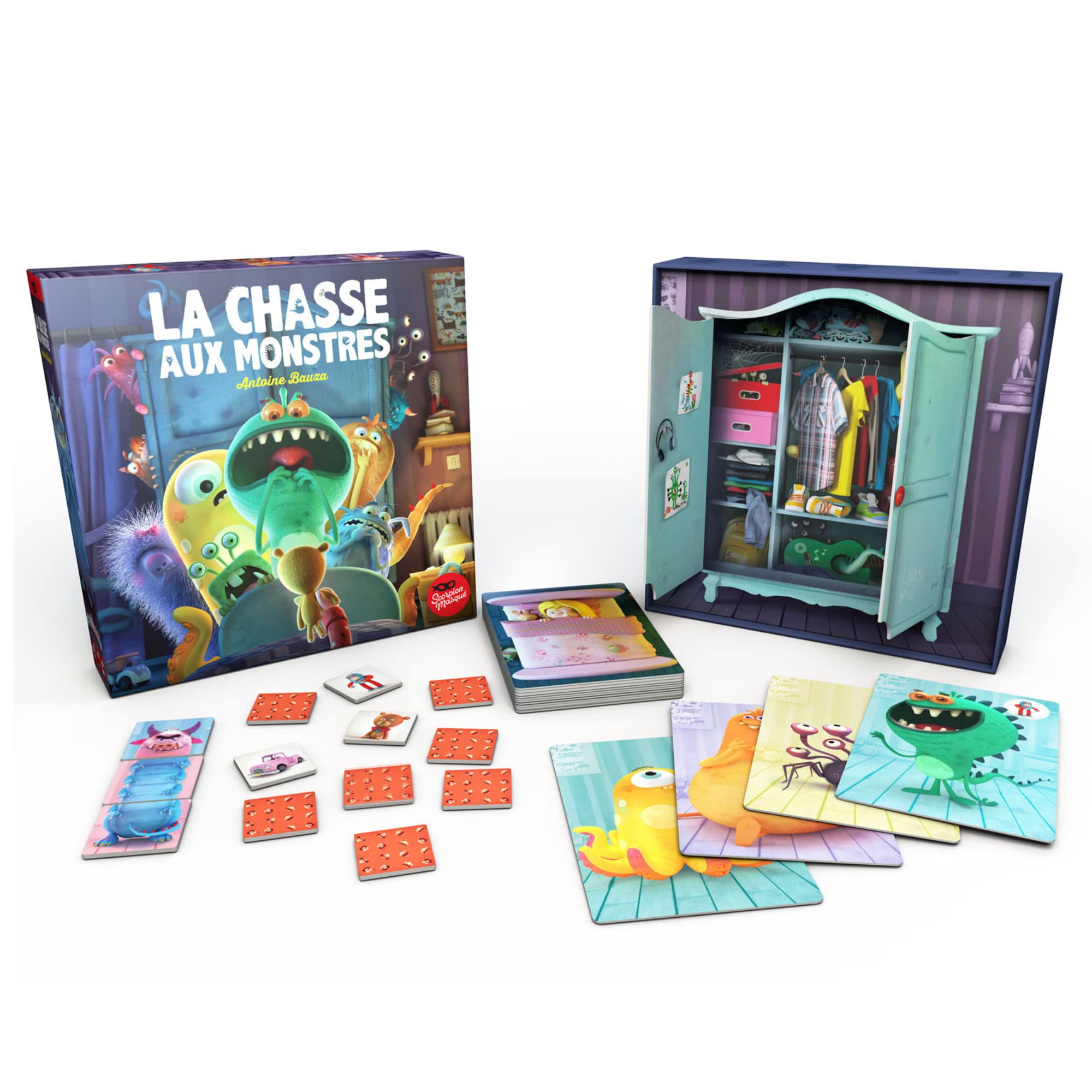 Ce long préambule pour vous parler de La Chasse aux Monstres, une petite boîte qui nous vient du Canada et qui réussit à mêler mémoire et coopération. Le jeu s’adresse aux tous petits et tout est réussi: les illustrations sont aussi magnifiques que rigolotes, les règles sont aussi simples que jouissives, le plaisir d’y jouer aussi présent que durable. Le jeu a été réédité, relooké et est encore plus sympa qu’à l’origine !