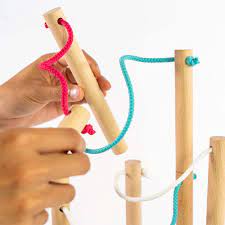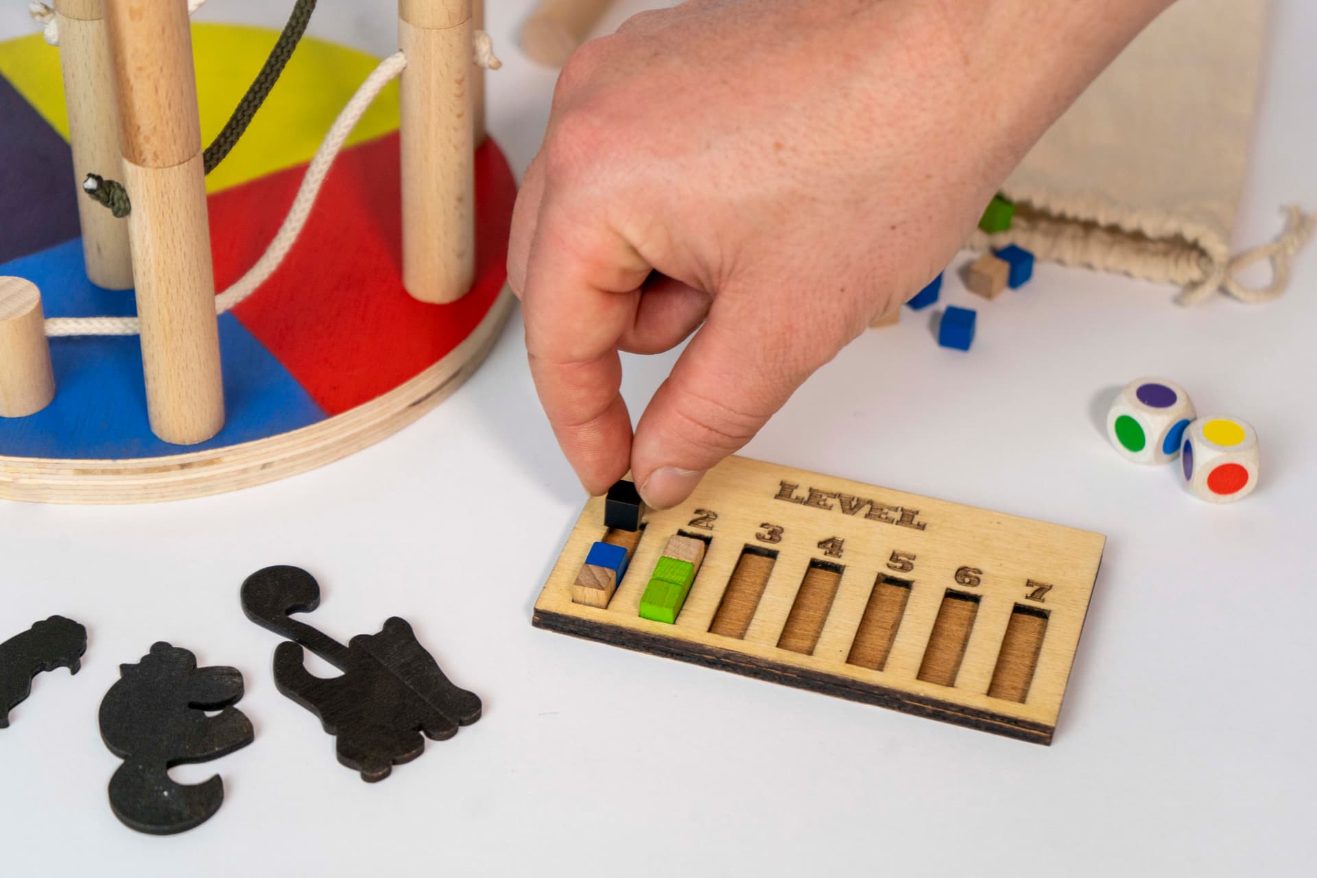 Comme vous pouvez le voir sur les images ci-dessus ou dessous, il va effectivement falloir empiler des pièces sans faire tout tomber. Si on arrive à toutes les placer c’est gagné, tout simplement. Avec les petits chats bien accrochés aux cordes, c’est encore mieux. On va donc jouer chacun à notre tour en commençant par lancer un dé couleur pour savoir dans quelle zone de petit plateau rond (qui sert de support à la construction) il faudra agir. Ensuite place au tirage d’un petit cube dans un sac qui vous indique la couleur de la corde qu’il va falloir jouer (il y a des petites, moyennes ou longues). Il n’y a plus qu’à poser la pièce sur le plateau ou sur une autre pièce. Ou les deux. Bien sûr il y a quelques contraintes à respecter: les cordes ne peuvent pas se toucher ou sortir du cercle par exemple…